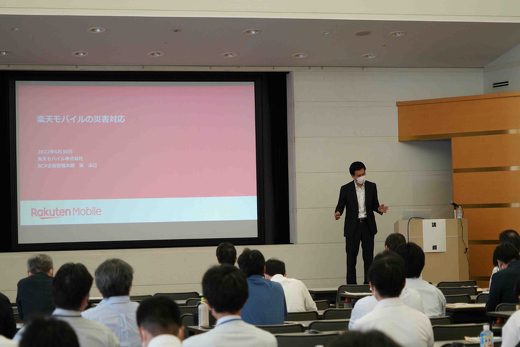 2018年4月の周波数割り当てから約3年、自社網での通信ネットワーク拡大に伴い2021年8月にBCP専門組織を設置しました。2022年2月1日に指定公共機関に指定されて間もない楽天モバイルの災害対応体制強化の取組をご紹介いただきました。